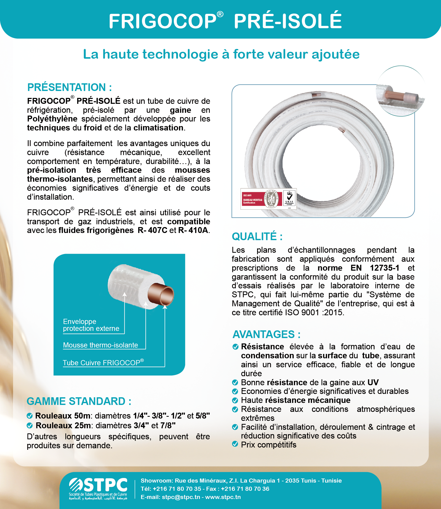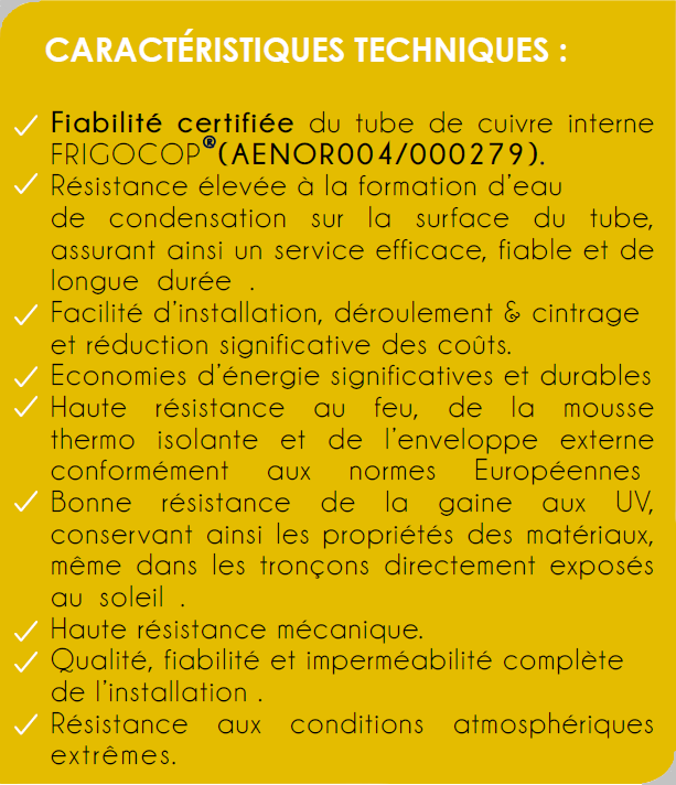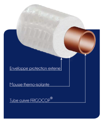 FRIGOCOP® PRÉ-ISOLÉ" est un tube de cuivre de réfrigération, pré-isolé par une mousse thermo-isolante et une enveloppe de protection externe en Polyéthylène,