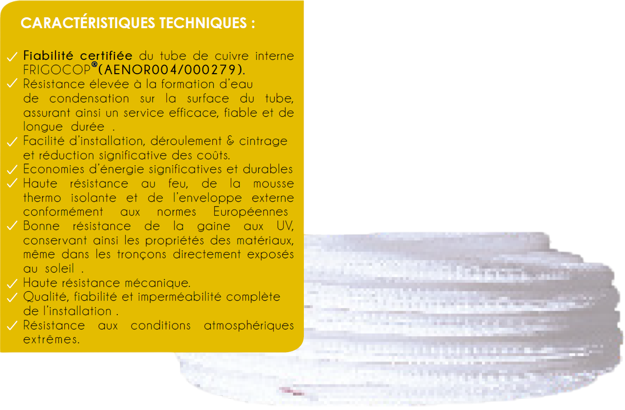 FRIGOCOP® PRÉ-ISOLÉ" est un tube de cuivre de réfrigération, pré-isolé par une mousse thermo-isolante et une enveloppe de protection externe en Polyéthylène,